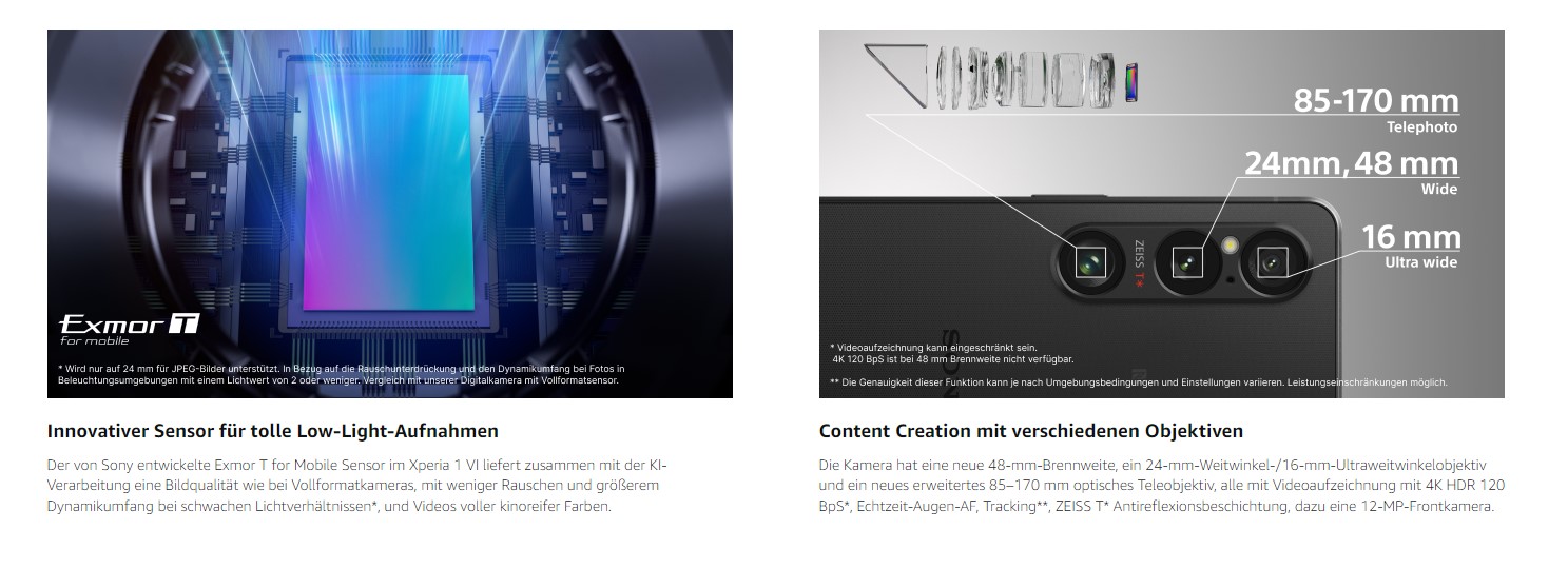 - Erstklassiger Klang, laut oder mit Kopfhörern Mit dem neuen Premium Audio Circuit für kabelgebundene 3,5-mm-Kopfhörer, einem neuen, leistungsfähigeren Lautsprecher und innovativen Audiotechnologien gibt das Xperia 1 VI der Musik den Raum, die Klarheit und die Qualität, die sie verdient - über kabelgebundene oder kabellose Kopfhörer oder über die Full-Stage-Stereolautsprecher. Die neuesten Technologien und Formate der Audioindustrie lassen sich auf diesem Smartphone entdecken, einschließlich High-Resolution Audio, High-Resolution Audio Wireless, LDAC, Bluetooth*1 LE Audio (Low Energy) und Snapdragon Sound*2.