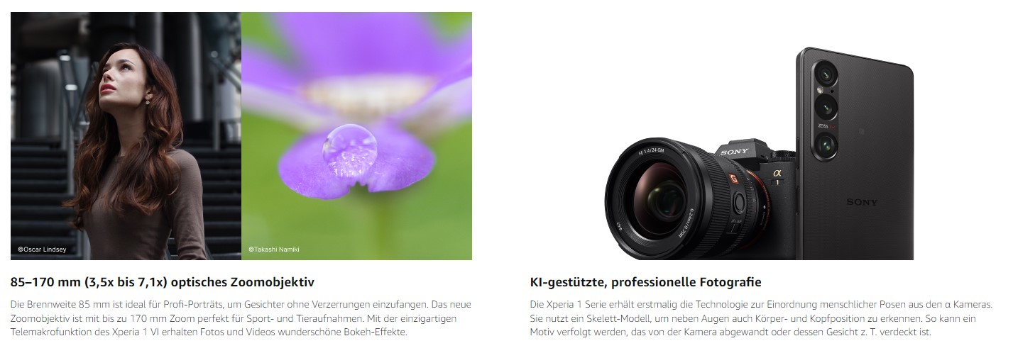- Profi-Fotografie, KI-unterstützt Der von Sony entwickelte Exmor T for Mobile-Sensor liefert zusammen mit der KI-Verarbeitung eine Bildqualität, die der von Vollformatkameras entspricht, mit weniger Rauschen und einem größeren Dynamikbereich bei schlechten Lichtverhältnissen. Das neue verlängerte 85-170-mm-Teleobjektiv bietet einen echten optischen Zoom (3,5- bis 7,1-fach äquivalent) für unverfälschte Bilder bei jeder Brennweite. In Kombination mit optischer Stabilisierung und Real-Time Eye AF ist es ideal für Porträts. Die einzigartige Telemakro-Funktion für Fotos und Videos ermöglicht Aufnahmen aus größerer Entfernung und ein wunderschönes Bokeh.