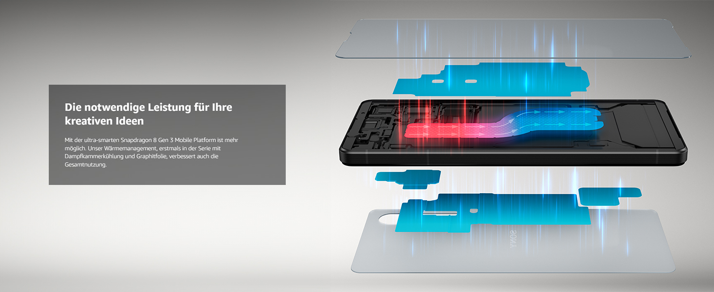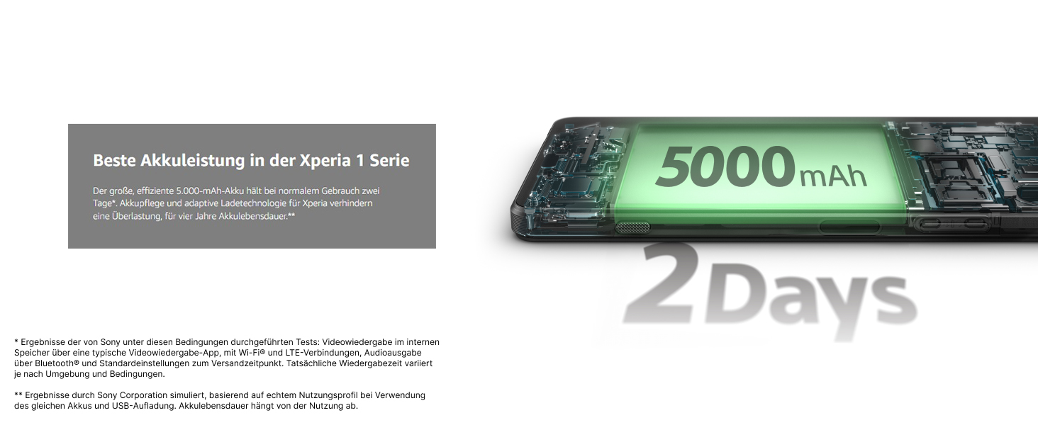 - Herausragender Akku und beeindruckende Leistung von Xperia Der große und effiziente 5.000-mAh-Akku ist für eine typische Nutzungsdauer von zwei Tagen*1 ausgelegt, und das bei einem Gewicht von 199 g. Die ultra-intelligente Snapdragon 8 Gen 3 Mobile Platform*2 eröffnet eine neue Ära der Möglichkeiten. Dieser leistungsstarke Prozessor erweitert die KI-Fähigkeiten des Xperia 1 VI und bietet eine konkurrenzlose Kamera-, Audio-, Spiele- und Displayleistung. Dieses Sony-Smartphone verfügt über ein fortschrittliches Wärmemanagement: Es ist das erste Xperia 1 der Serie mit einem Vapor-Chamber-Kühler und einer Graphitplatte, welche eine besseren Allround-Nutzung ermöglichen.