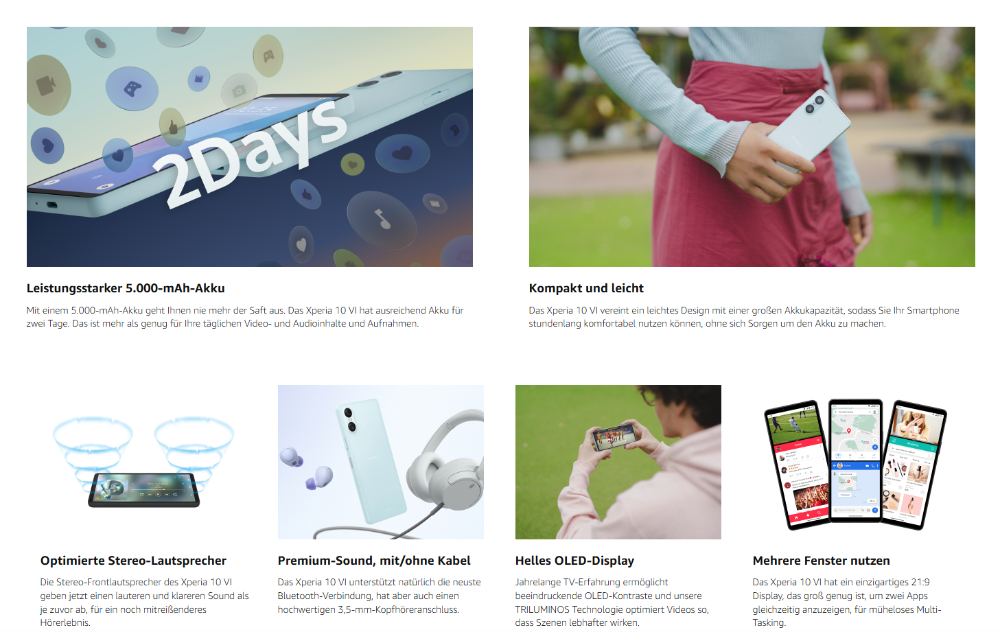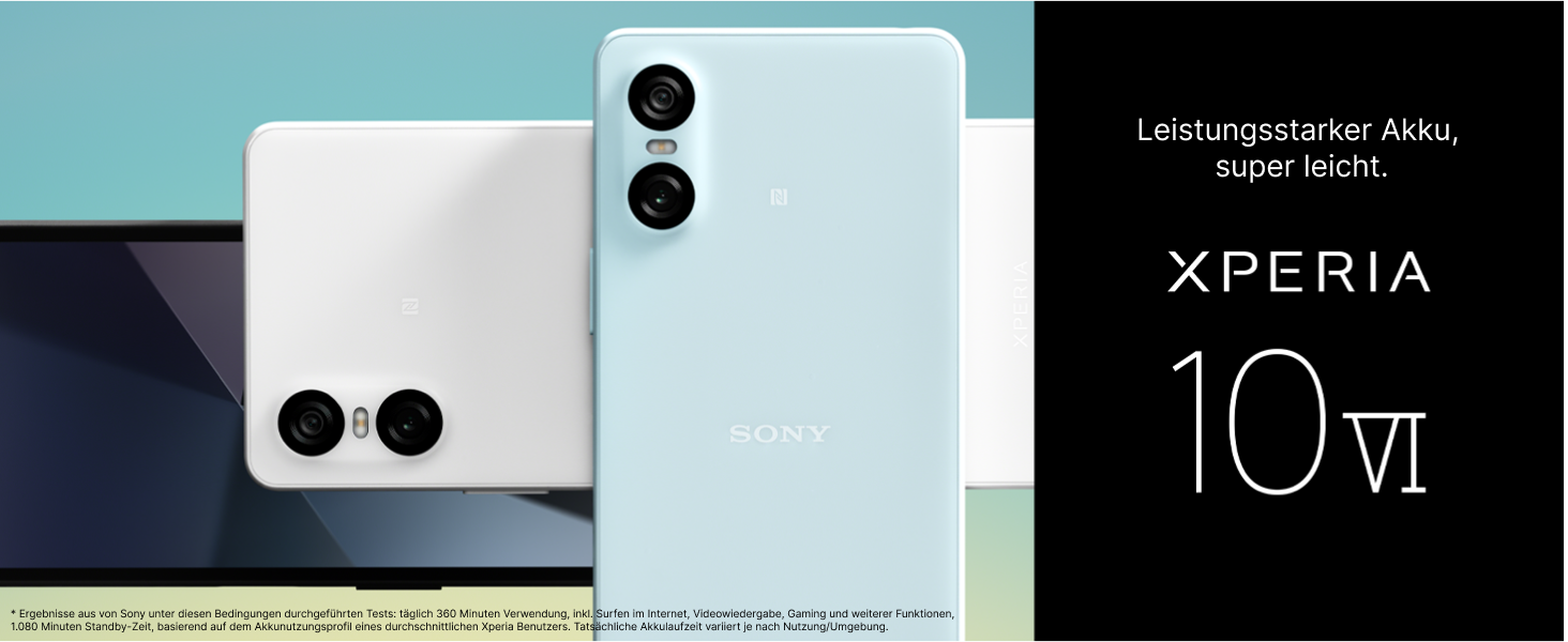 - 2 Tage Akkulaufzeit*1 in einem superleichten Gehäuse Mit einem 5.000-mAh-Akku geht garantiert nicht die Energie aus! Der Akku des Xperia 10 VI reicht für zwei Tage. Das ist mehr als genug für das tägliche Ansehen, Hören und Fotografieren. In Kombination mit seinem superleichten und kompakten Gehäuse ist dieses Sony Smartphone das perfekte Gerät für den Alltag.