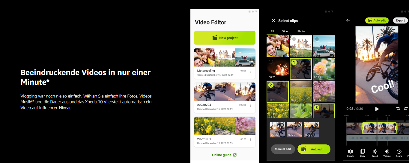 - Einfaches Aufnehmen und Bearbeiten, für Kreativität unterwegs Dieses Sony Mobiltelefon verwendet eine AI-Technologie zur Erkennung von Szenen, Bedingungen und Motiven, die automatisch die idealen Einstellungen für die beste Aufnahme auswählt. Vlogging ist mit dem automatischen Video Creator ganz einfach, und mit drei Objektiven von Ultraweitwinkel bis Teleobjektiv können Aufnahmen noch abwechslungsreicher gestaltet werden.