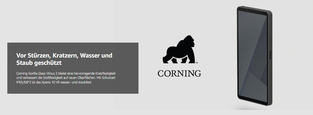 • STRESSFREIE LANGE NUTZUNG: Das Display des Xperia 10 VII nutzt Corning Gorilla Glass Victus 2. Es bietet eine hervorragende Kratzfestigkeit und verbessert die Stoßfestigkeit auf rauen Oberflächen. Außerdem ist es gemäß Schutzart IP65/68*2 wasser- und staubfest.